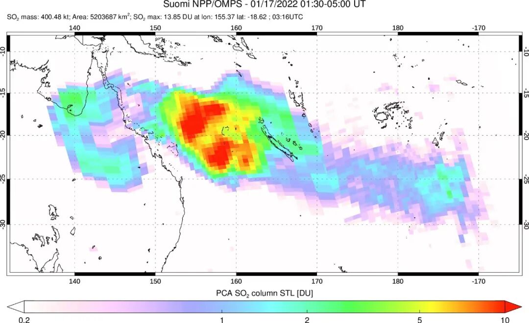 而本次的汤加火山爆发,强度虽然足够高,但根据美国航天局NASA的卫星测量数据表明,截止至1月17日,其喷出的二氧化硫为400.48千吨,不足1991年皮纳图博喷出二氧化硫的2%,因此不足以对全球气候造成明显影响