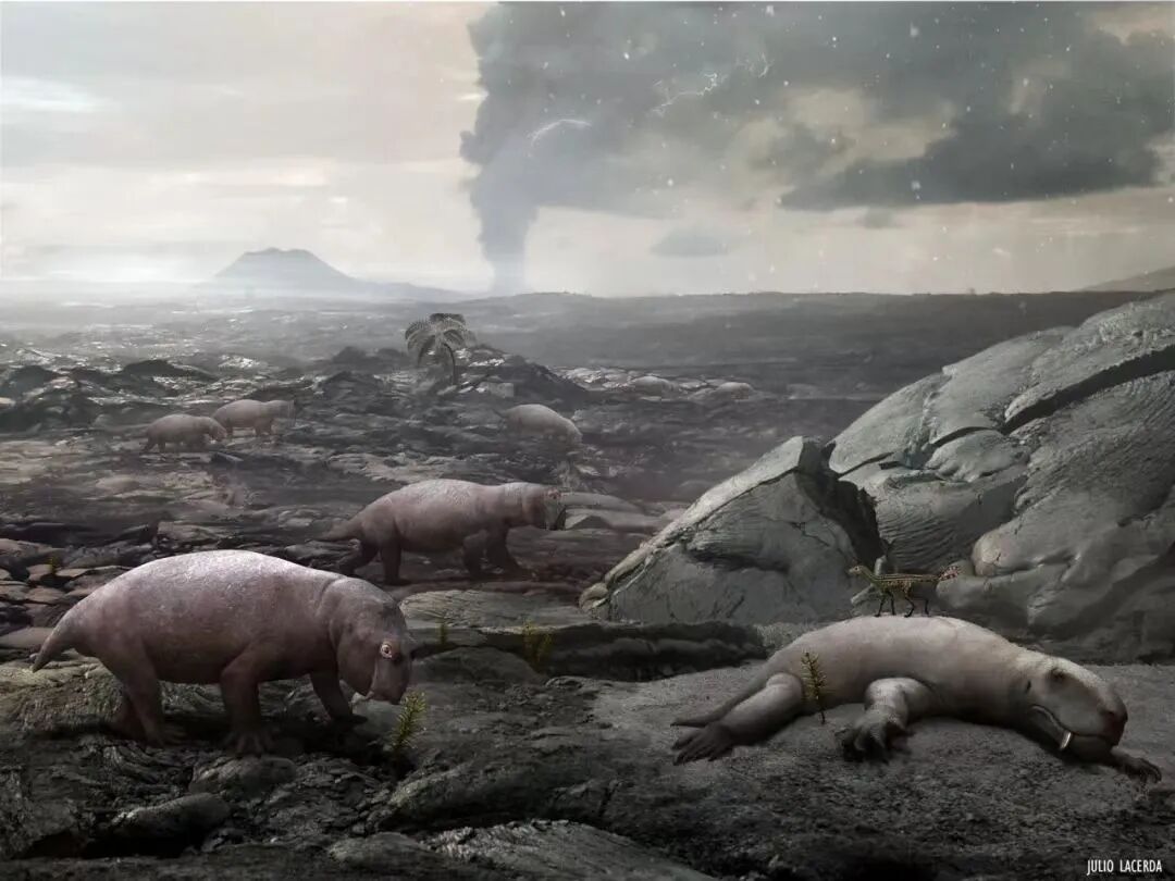 来自太空的陨石撞击,携带的巨大能量掀起了部分底壳,全球各地的火山开始剧烈喷发,释放出大量的尘埃。这些尘埃在空气中持续悬浮,阻挡了阳光的热量,地球进入了寒冷的冰期。约72%的物种因此灭绝。