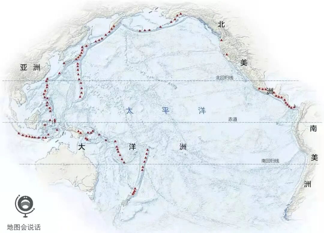 太平洋虽然是世界最大的海洋,但它正在消亡。太平洋板块在边界发生俯冲,构造活跃,形成环太平洋火山带,集中了世界上2/3的火山,如同一个“火环”。图/地图会说话