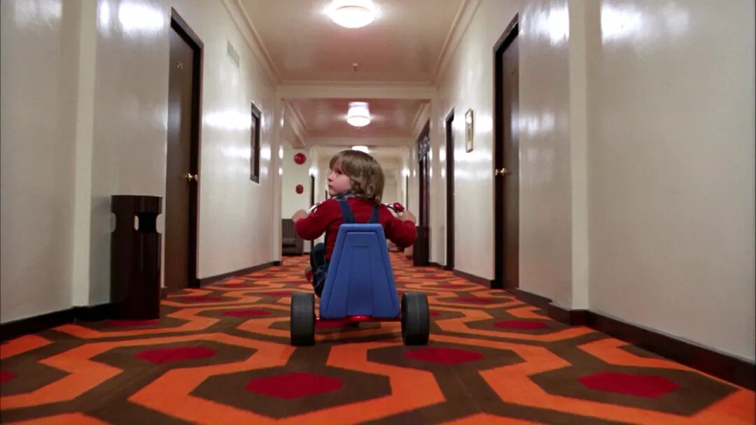 《闪灵》中别墅的走廊铺设了碎花壁纸和鲜艳的几何图案地毯,让人感到温馨的同时,走廊两侧紧闭的房门又传递出了隐隐的不安全感。