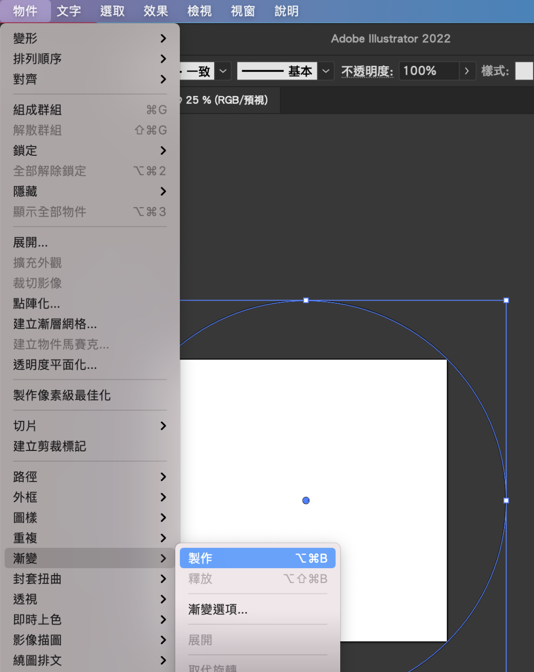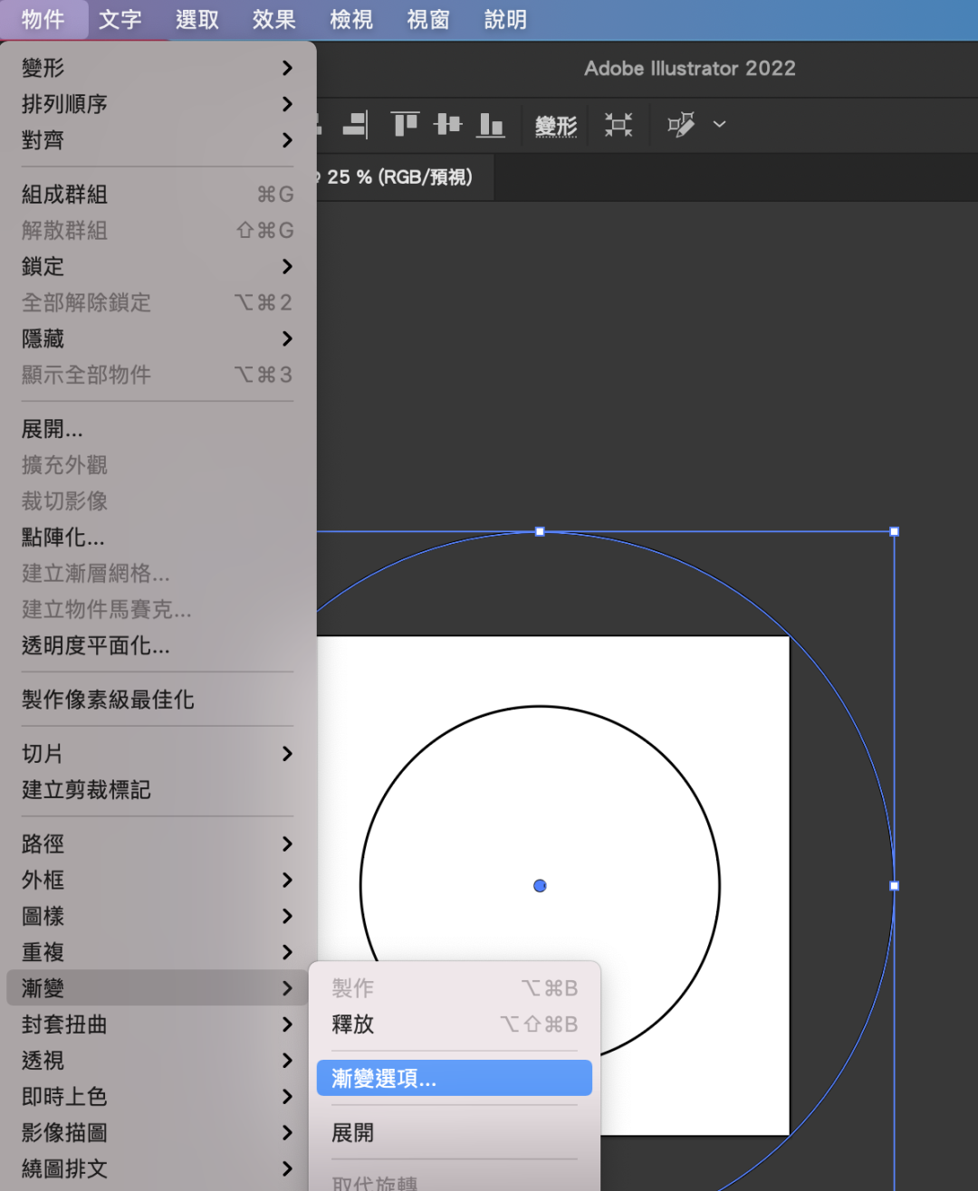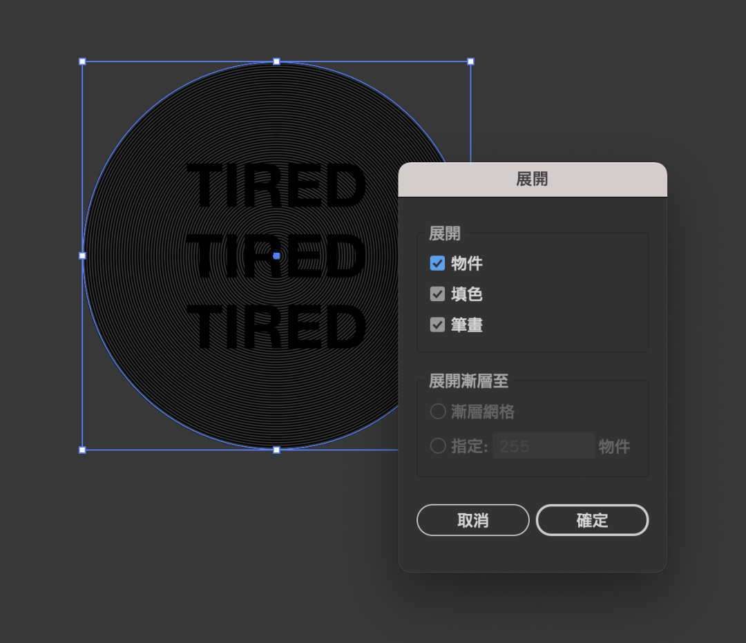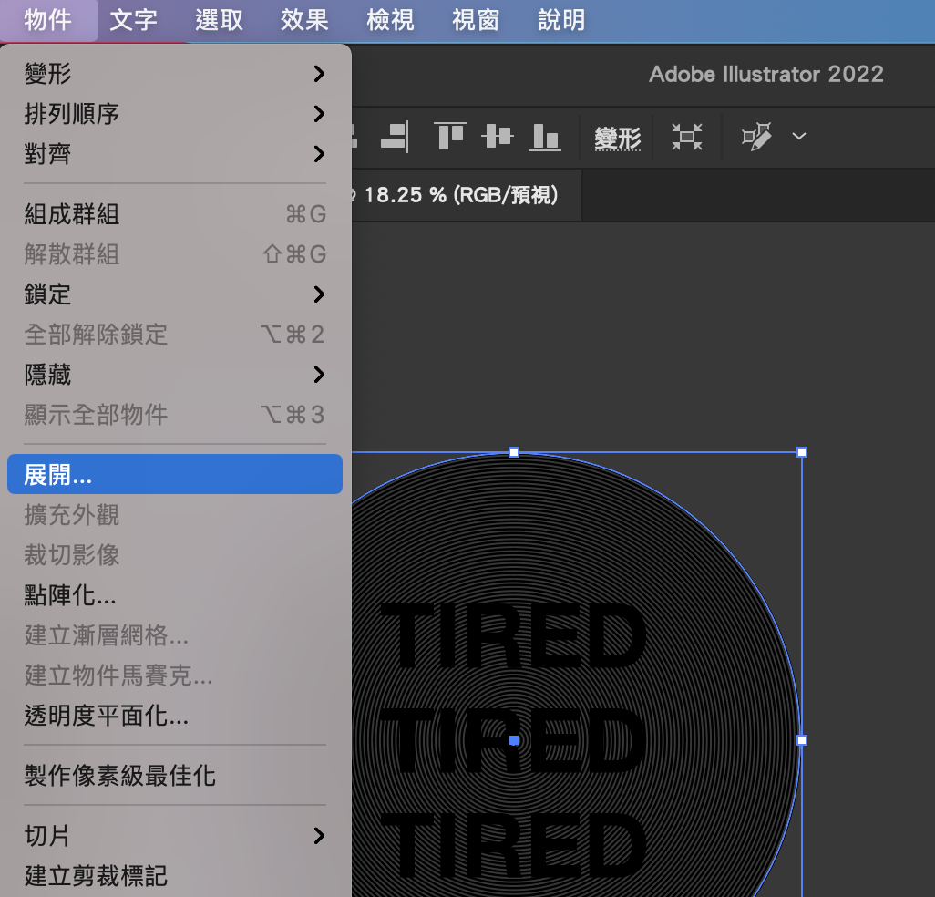 5. 点选组件的圆,到功能表的“物件”选择“展开”直接按下确定,此时会做个2次,最终要让改变形状,变成图。
