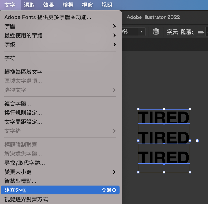 1.使用「文字工具」输入想要的文字,选择「文字,到功能表的」,选择「建立外在」。