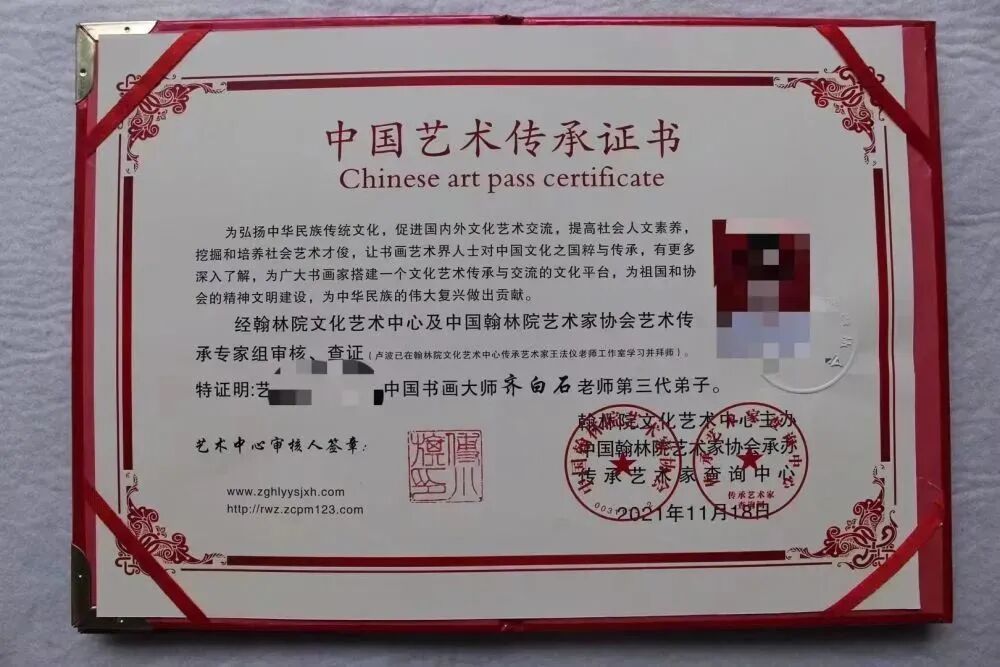 “你想办理传承吗?只要3000元,还可以参加齐白石二代弟子线上课程,结业后就会收到‘中国艺术传承证书’,并被认定为‘中国书画大师齐白石再传弟子’”。该工作人员展示的证书显示,经有关“专家组”审核、查证后,不少人已被认定为“齐白石第三代弟子”。而即使没有任何相关资历,也能成功入会。“我们就是专业干这个的。”工作人员说。