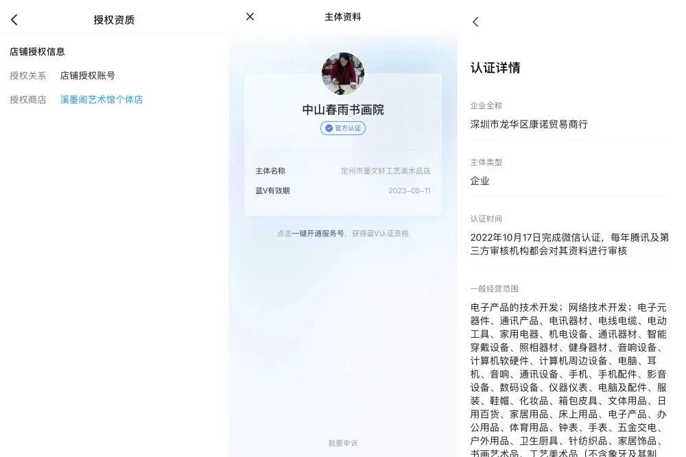 根据调查发现,这些具有“高大上”名字的直播间,经营资质多为个体工商户或私人企业:“群英书画”注册信息显示为“溪墨阁艺术馆个体店授权账号”;“睿云四海”显示为“深圳市龙华区康诺贸易商行”;“中山春雨书画院”显示为“定州市墨文轩工艺美术品店”……