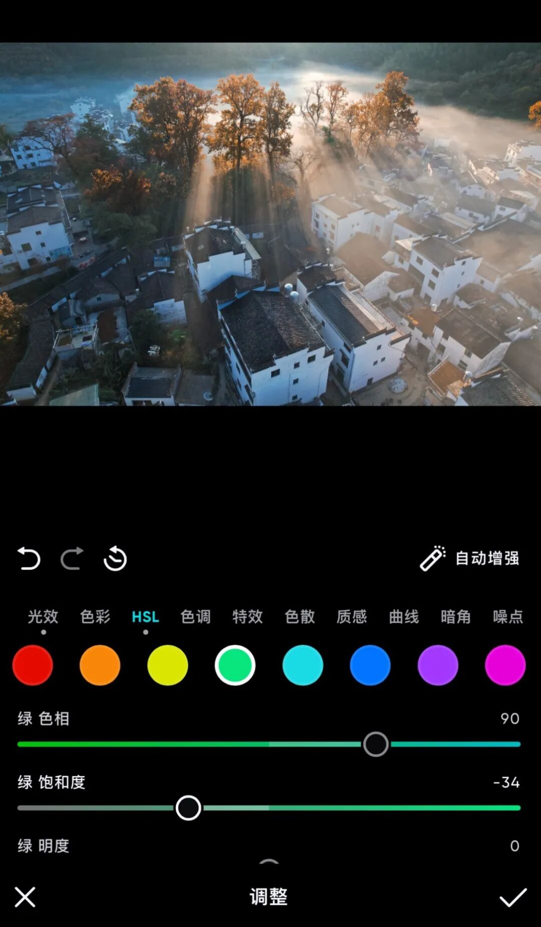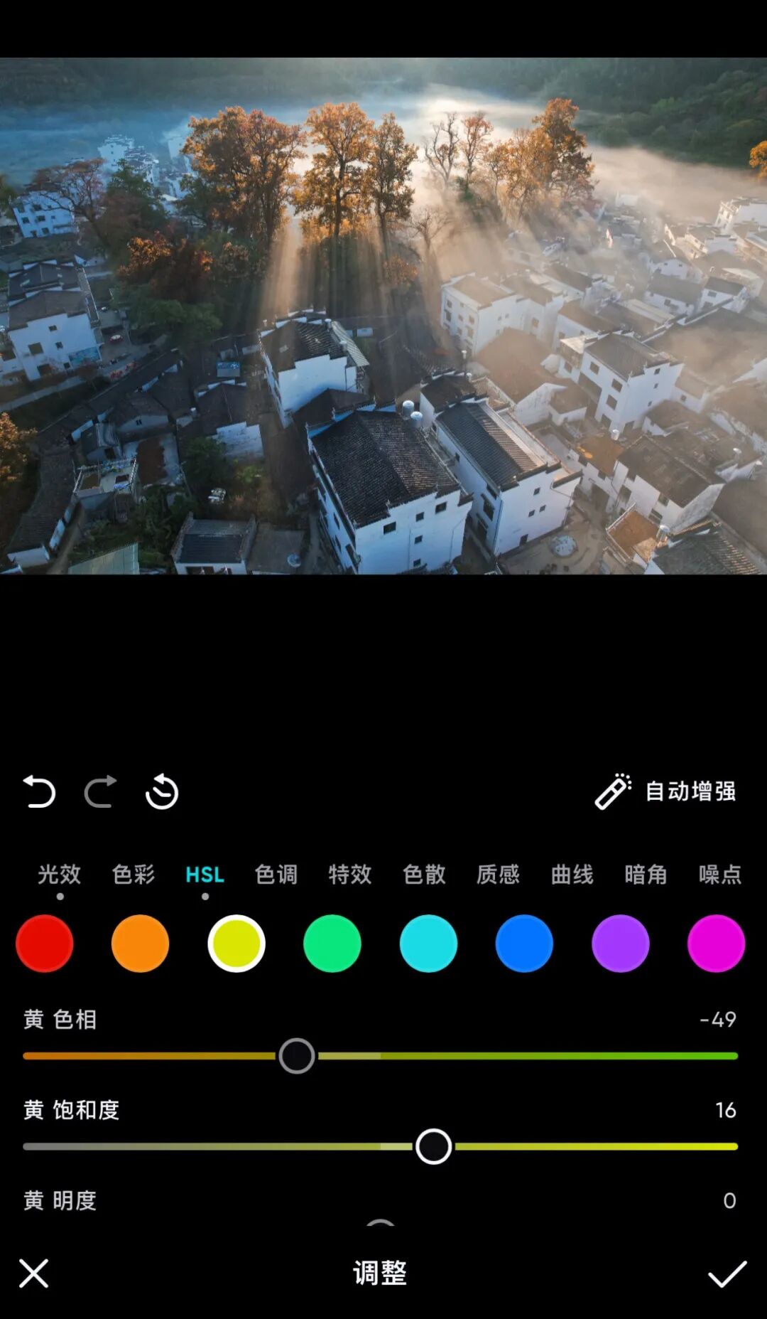 在HSL工具中,选中黄色色块,把黄色的色相往左偏移,饱和度+16,让树叶的黄色变为橙色调;再选中绿色色块,把色相往右偏移,饱和度降低,让画面中的绿叶部分色彩偏青色调: