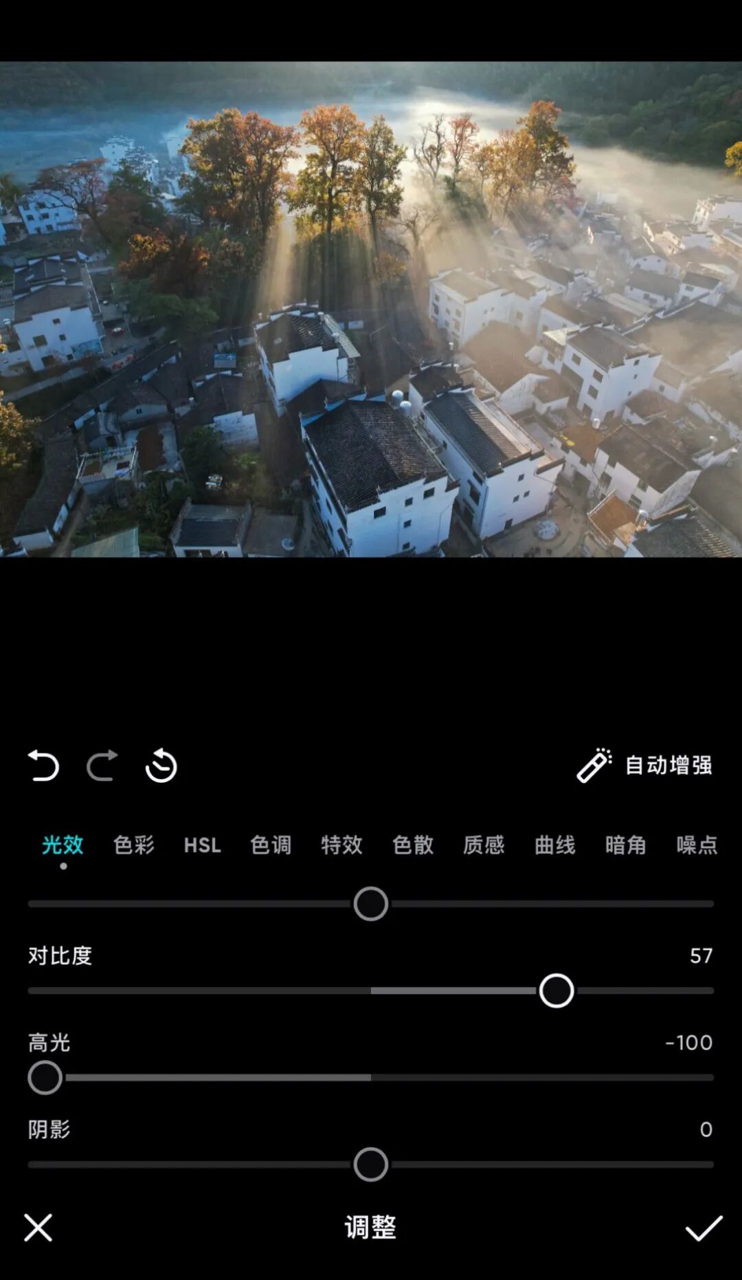 进入调整栏第1个工具【光效】,高光-100、对比+57,主要是降低高光,增强明暗对比: