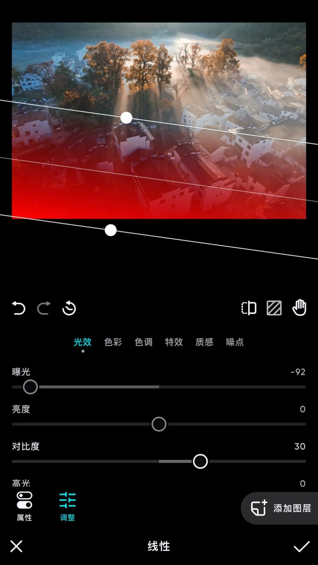 点右下方【选取局部】,进入选择线性工具,利用线性工具选中画面左下方区域,曝光-92、对比度+30,之后点击对勾,目的是压暗左下方前景区域: