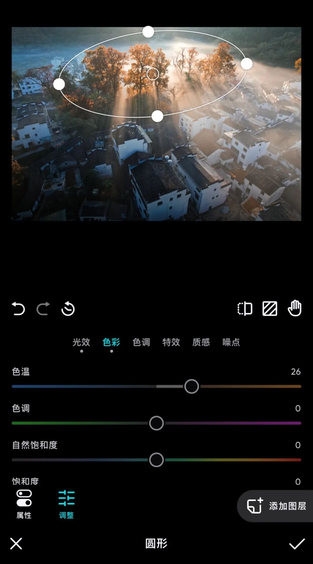 再次点击【选取局部】,进入圆形工具,利用圆形工具选中中间的树林部分,曝光+24、色温+26,之后点对勾,目的是让树林部分更加明亮饱满,突出树林的秋色氛围: