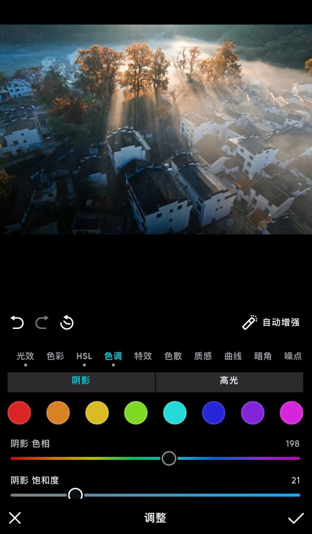 进入调整中,点击【色调】工具,选中阴影,把色相调到198、饱和度21,目的是增强照片中阴影部分的冷色调,从而加强照片的冷暖对比: