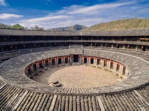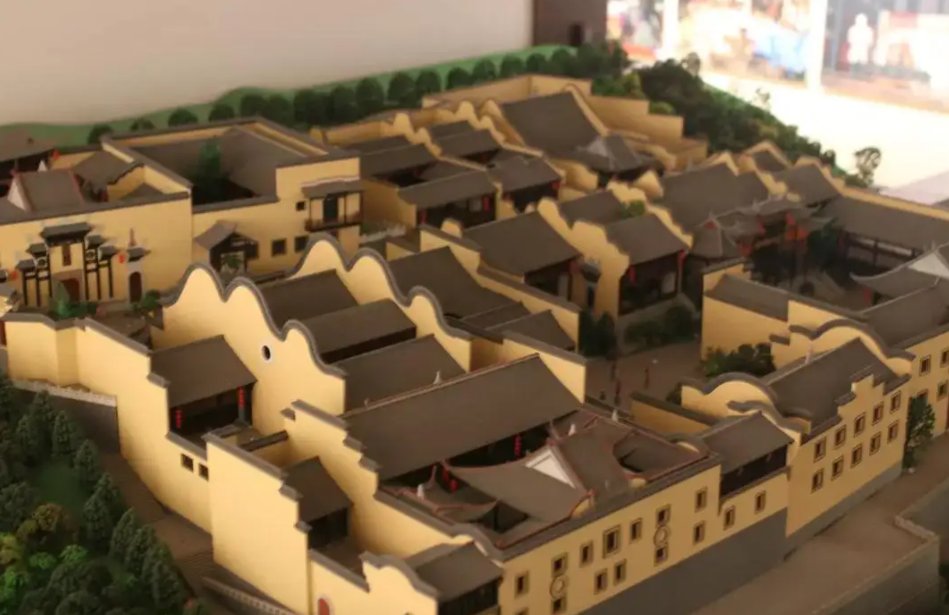 而其明显体现了闽派建筑的风格——堡垒式的建筑设计,单体规模的建筑,向心院落的建筑空间。我们以广东民居大东镇土楼为例,可以看出明显的相似风格。