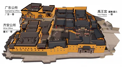 而禹王宫则代表湖南湖北。建于康熙年间,时间最早,现存面积最大。