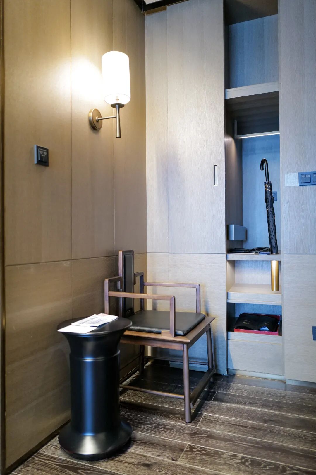 ▲ “管家柜”是我个人很喜欢的设计,我通常不喜欢因为多要了几瓶水而等着他们来敲门,也不乐意为取早晨的报纸或擦完的鞋而开门去取。只要抽开管家柜的门,所有的这些都已经在未开房门不用招呼的情况下送进房了。玄关角落处的一把当代风太师椅,让换鞋更从容舒适。