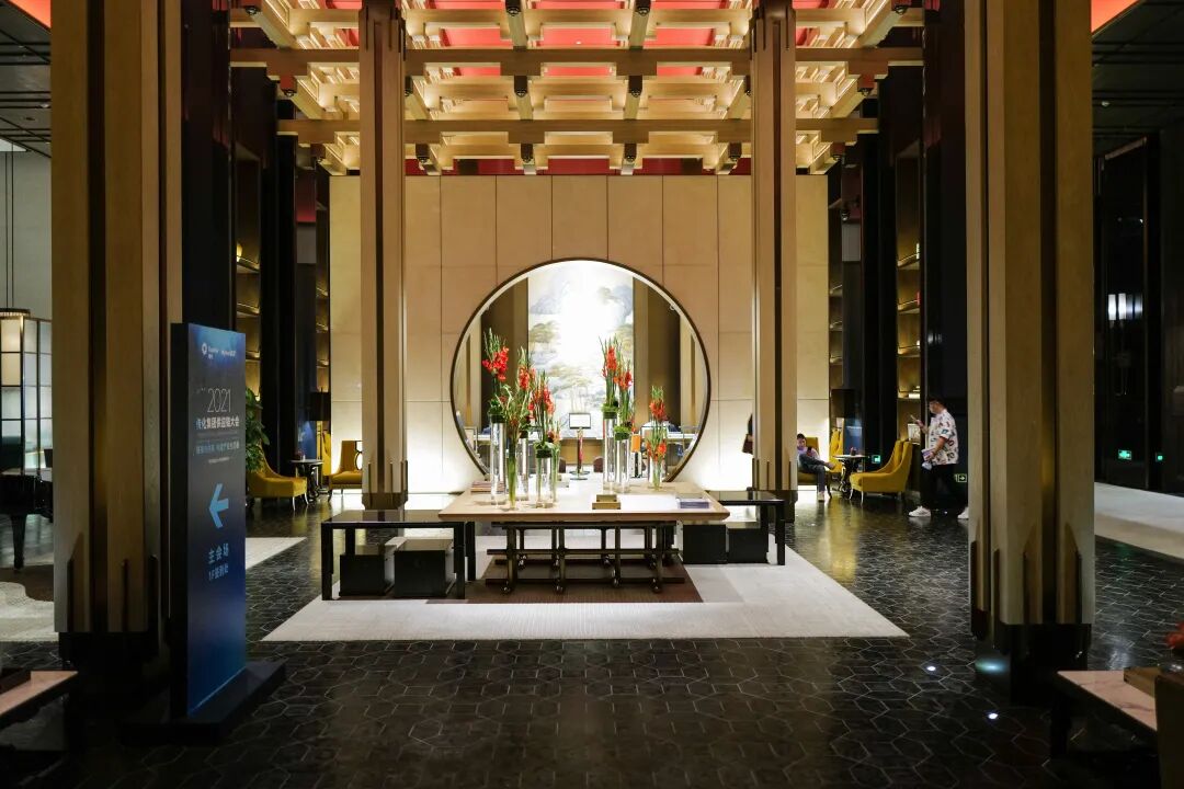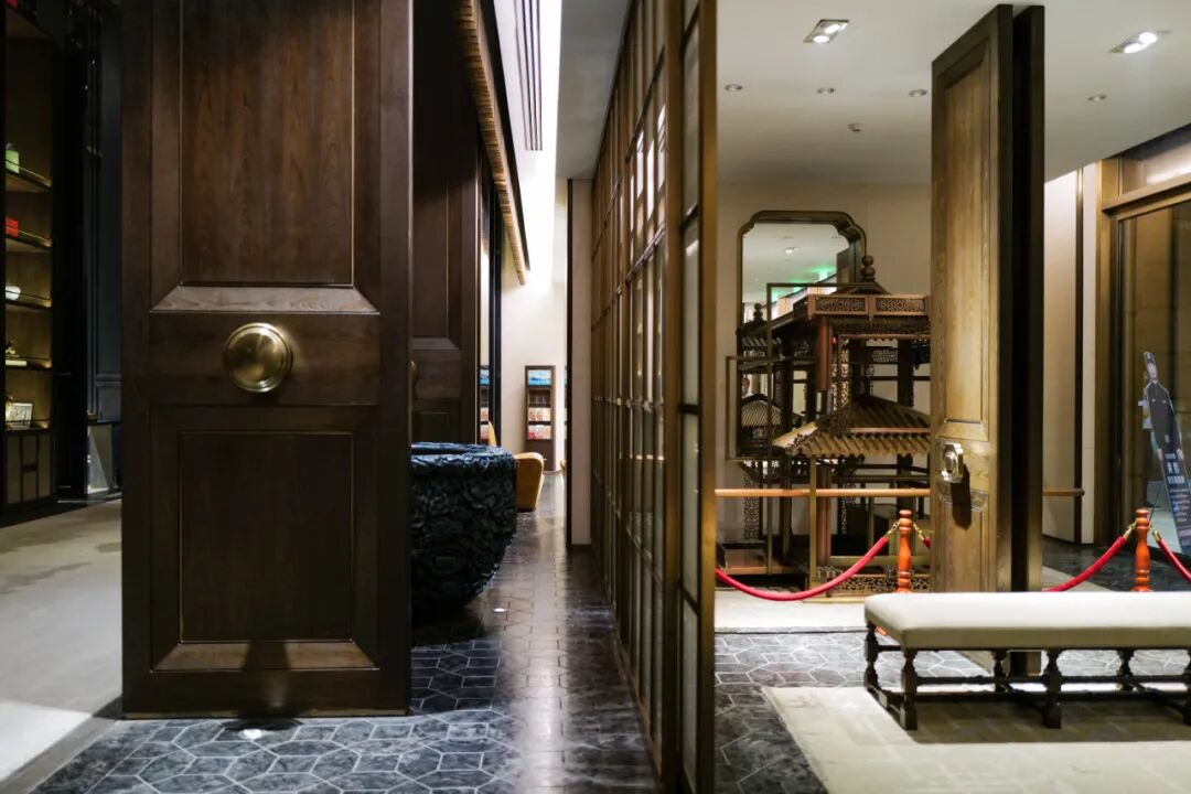 衔接落客区和前厅的挡风厅,在成排格子铜框玻璃门、长凳、轿子雕塑的渲染下,形成了一座革新演绎的轿厅(即旧时大宅供宾客和主人落轿起轿的地点),既为酒店恢弘深邃的前厅作了恰当别致的铺陈,也让中式气韵的舒展更舒缓从容。由此完成了对酒店“三进两廊”格局的底部空间层次的一进的呈现。