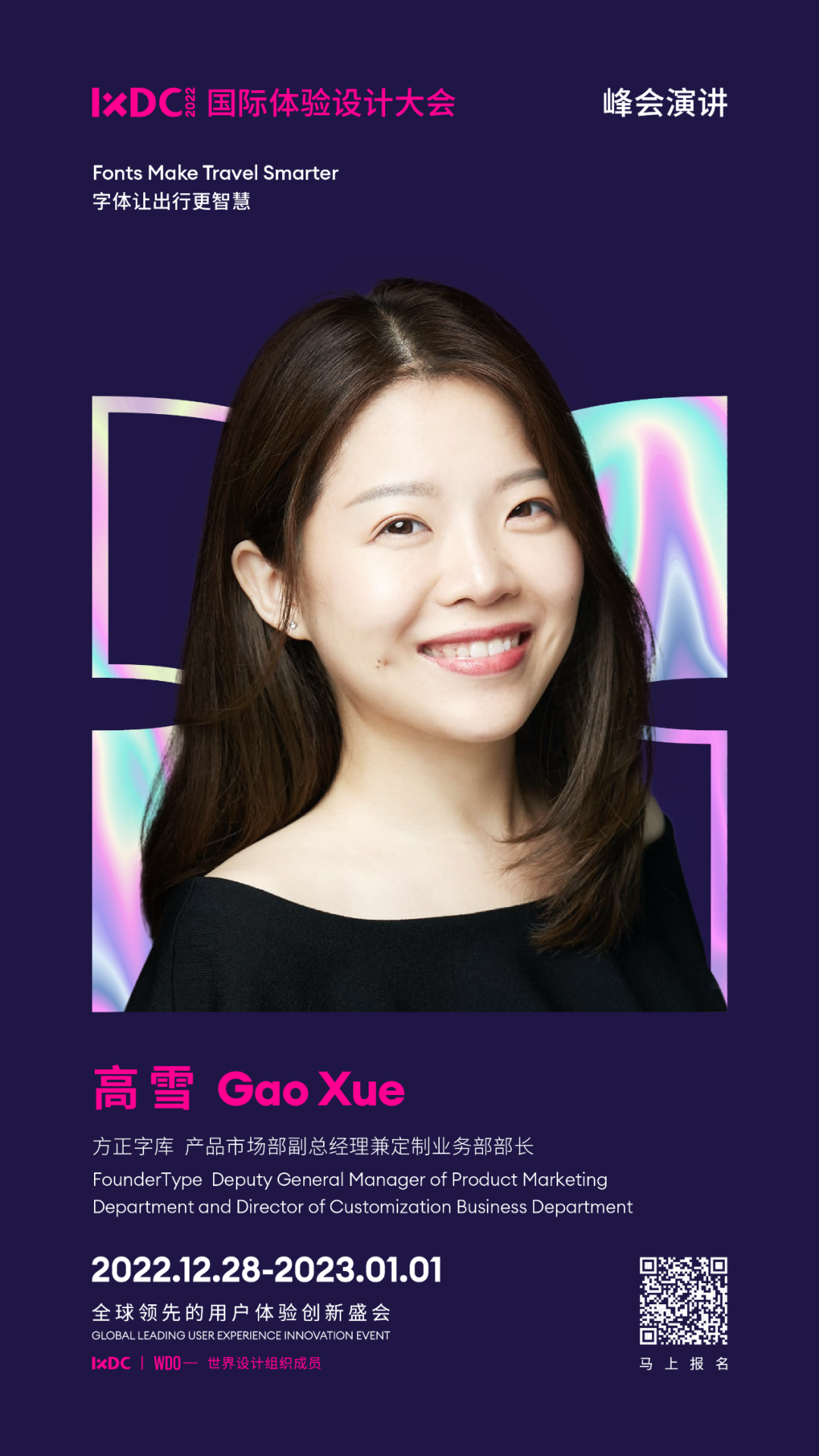 高雪女士毕业于中央美术学院视觉传达专业,现任方正字库产品市场部副总经理兼定制业务部部长,曾负责2022年北京冬奥会和冬残奥会定制字体、新华新闻体、京东朗正体、可口可乐在乎体、美团体、长安引力体、壹基金壹家人体、喜茶灵感体等项目。