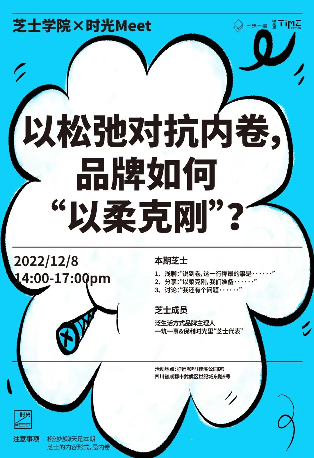 同样的,由Z/S STUDIO发起的专注设计、文化创意、生活方式与实战经营等领域的知识分享平台“芝士学院”同样持续观察着商业市场的变化。于是,时光MEET携手芝士学院于12月8日呈现了一期与当下的市场环境十分贴切的讨论——“以松弛对抗内卷,品牌如何以柔克刚”。