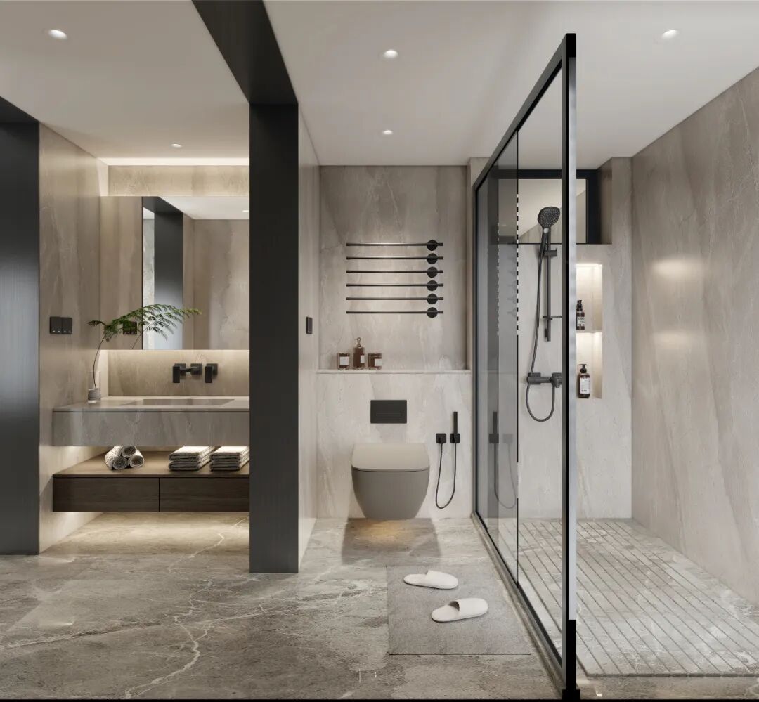 卫生间我们取消干区地漏,采用挂墙式卫浴和同层排水系统。充分考虑收纳,打理,防滑等因素。照明上我们考虑了无障碍起夜,夜晚上厕所从卧室到卫生间几乎不需要找开关。在淋浴房的上口,我们开了一个玻璃窗,这样可以将卫生间的采光引入厨房一部分。