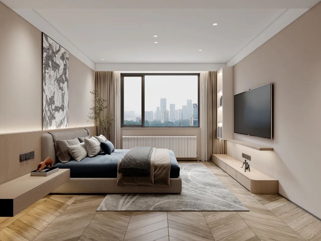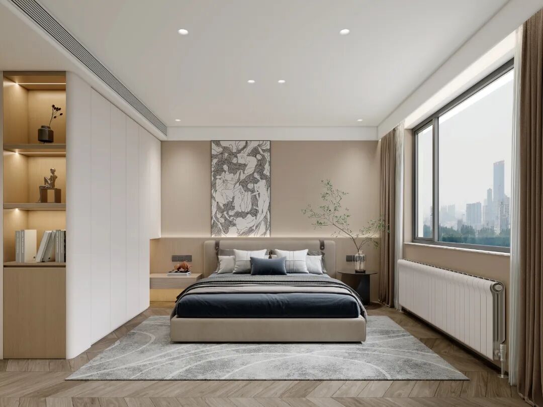 卧室我们依然设计了无障碍起夜背景,在床背的饰面后有一条触摸式的起夜灯,避免夫妻之间起夜时的相互干扰。简洁明快的造型,以及温暖的奶茶色使人更易入眠和休息。