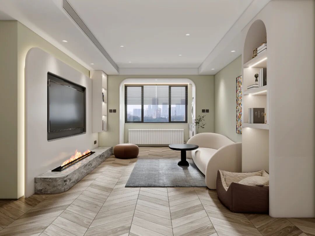 小户型不太适合用深色做墙面,选择大量的白色饰面一是为了与涂料背景有个对比,其次是浅色能使得空间更加的宽敞明亮。现代生活会客不在是大家一起做客厅看电视,因此沙发不需要太多,茶几的功能被淡化,沙发前流出的区域可用于亲子活动和跳操运动。整个空间的造型上,一些弧度的元素使得空间更加流畅和温润。考虑到空间的层高以及原始的窗高,我们放弃地暖改用壁暖更加合适。
