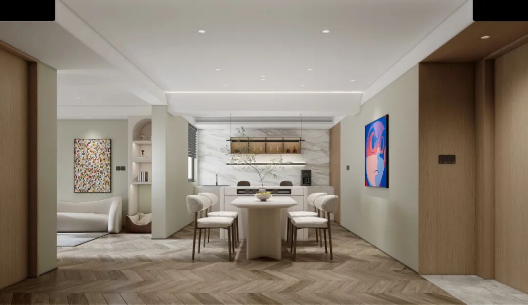 入户区域有个凹槽,用饰面来规整与分割入户区域与内部区域。餐桌直接连接着岛台,岛台后方是西厨。西厨右侧的另一个凹槽用于收纳,同样的木饰面柜门与入户处的木饰面形成呼应。公区选择牛油果色与鱼骨地板使得空间有更好的视觉感。从色彩心理学讲牛油果绿能给人放松与舒适的体验感,而鱼骨地板能扩大空间感。