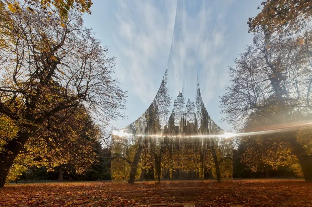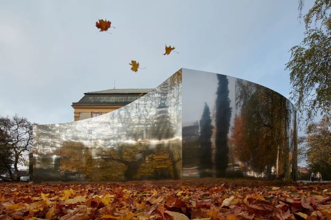 The last permanent installation is the mirrors of Zlín – a lyrical constellation of fluid shapes, poetically placed among the most beautiful trees of Zlín‘s park, whose treetops, flowing sky, and curious passing visitors they reflect. The soul of this part of the installation is a sound composition that is a celebration of the cycle of time, the turning of the seasons, the lengthening and shortening of the days, the moments of equinox and solstice, which functions as an unpredictable, surprising solar calendar or astrological clock. The basis for the music composition that sounds through the park in various phases of the year was a careful mapping and study of the sounds of bells in the belfries of the Zlín Region. Thus the park rings with the vibrations of bell bronze, which creates a scaled-down geographical imprint of the Zlín Region. The individual multi-channel musical compositions and their exact position in time and the year correspond to a study of the movement of the sun and stars.