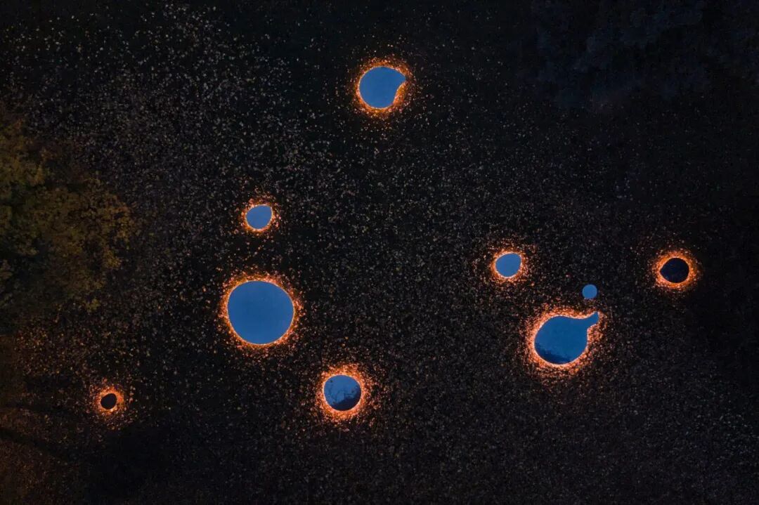 最后一个永久装置是兹林的镜子——一个充满诗意的流动形状的星座,诗意地放置在兹林公园最美丽的树木之间,它们反映了树梢、流动的天空和好奇的过客。这部分装置的灵魂是一种声音组合,它是对时间循环的庆祝,季节的转变,白天的延长和缩短,春分和冬至的时刻,它的功能是一个不可预测的,令人惊讶的太阳历或星象钟。在一年中不同时期贯穿公园的音乐构成的基础是对兹林地区钟楼钟声的仔细测绘和研究。因此,公园回荡着青铜钟的振动,这创造了兹林区域按比例缩小的地理标记。个别的多声道音乐作品及其在时间和年份中的确切位置对应于对太阳和恒星运动的研究。