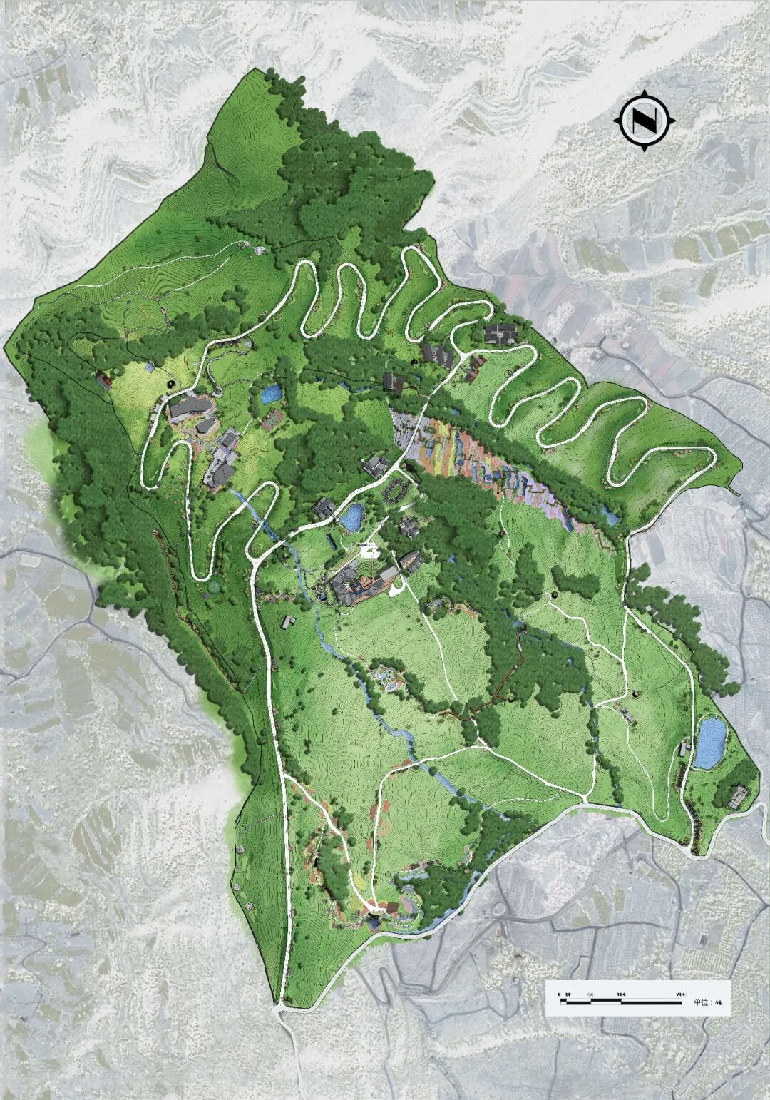项目位于成都龙泉山脉中段龚家山顶,海拔1000米,项目面积约为98.3公顷。易兰团队从2019年开始持续为淮州云顶牧场项目提供了“项目总体规划—建筑景观方案及施工图设计—室内设计”的全过程服务。