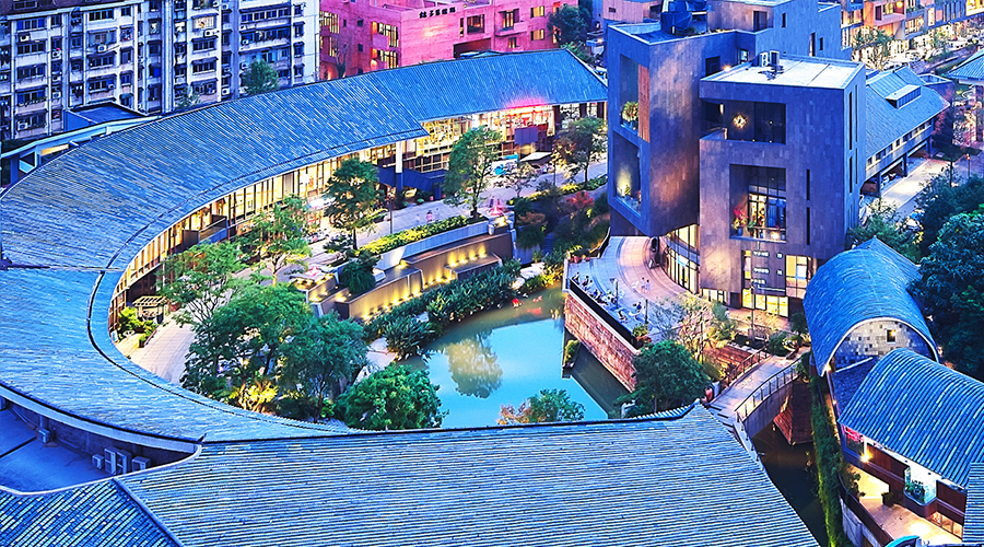 项目位于湖南省湘潭市九华经济开发区,地理位置优越。本项目着力打造差异化的商业综合体,融合沉浸互动式景观,令场地聚集人气,焕发新的商业生机。设计利用水景,打造水上步行街,把水上集市搬进购物天堂,创造文、商、游、休、乐多元功能混合的自有 IP、自带流量、自成系统的一体化新模式。