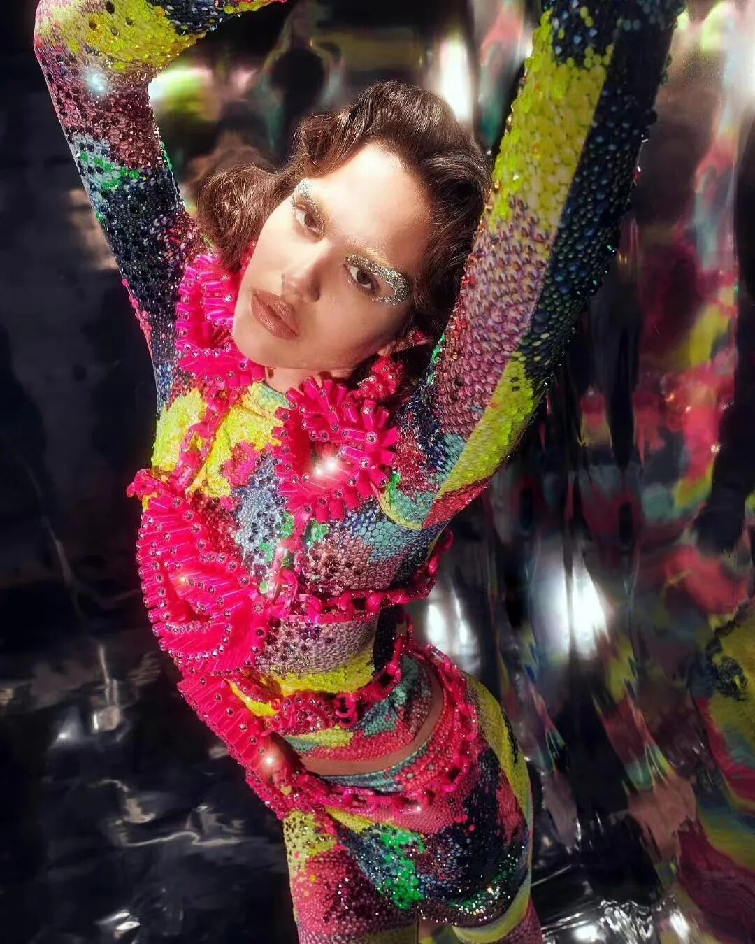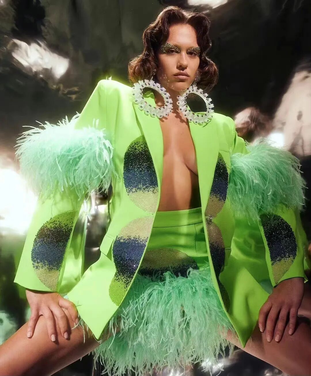 Kevin Kevinier他从未来主义愿景中汲取灵感,因此在他的设计中都能看到具有雕塑感、带有亮片的夹克和连衣裙。
