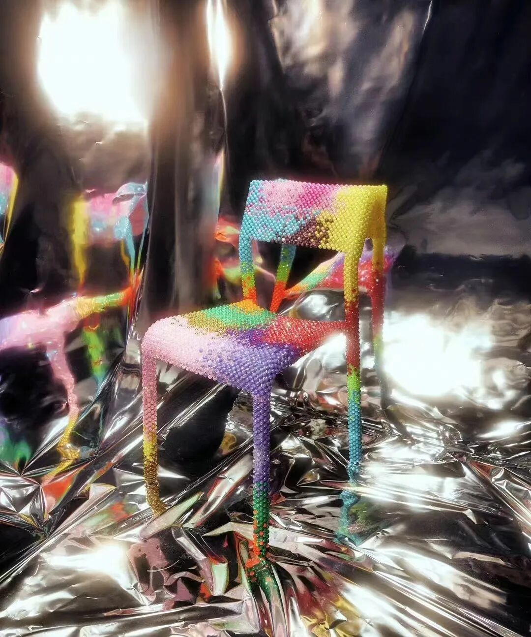 以追求的可持续发展为初衷,在产品创作初期,Kevin找上施华洛世奇滞销的商品,很多布料也是购买的滞销品,串珠塑料由海洋垃圾改造而来……