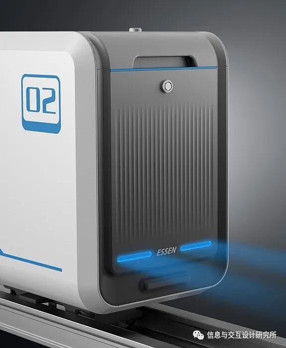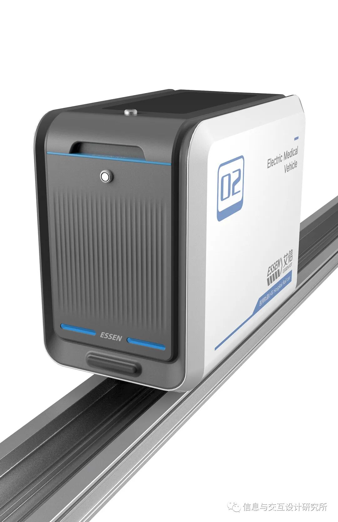 设计整体简洁亲和,视觉上通过白色与灰色的对比、局部搭配蓝色作为点缀,塑造出产品的专业亲和的形象;前后的壳体上增加了肌理,在丰富产品细节的同时,降低了产品的冰冷感,与市面同类产品拉开较大的差距。医用轨道小车智能物流传输系统水平传输速度高达1000箱/小时,实现时间、人力双节省,提升就医效率。