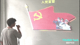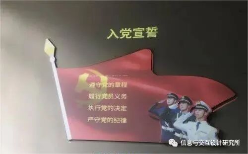 入党宣誓墙:主要以红色和黄色为主基调。通过雷达感应设备,体验者只需将手放在党徽的位置,党旗开始发光并且引入宣誓词,视觉效果干净利落,让体验者重温庄严地入党宣誓。