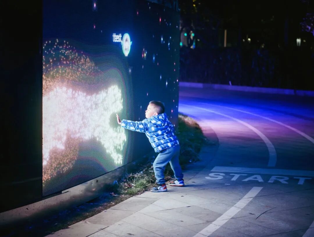 屏幕兼具互动特效,通过物联网传感器技术,参与者不仅可以与自己赛跑,还可以与其他参赛者的虚拟影像一起竞技。