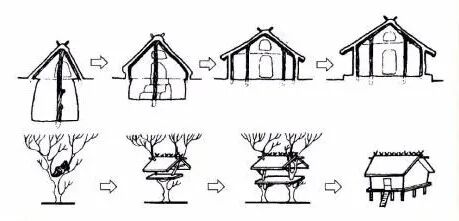 人类最早的居住方式是“天然岩洞”,后来才演化出“巢居”和“穴居”,再后来逐渐变成“半穴居”和“地面建筑。(如上图)