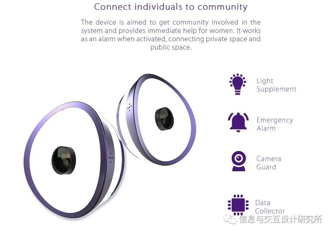 产品同时也将人与社区联系起来,让社区参与到系统中,并为妇女提供即时的帮助。当被激活后它作为警报连接私人与公共空间。
