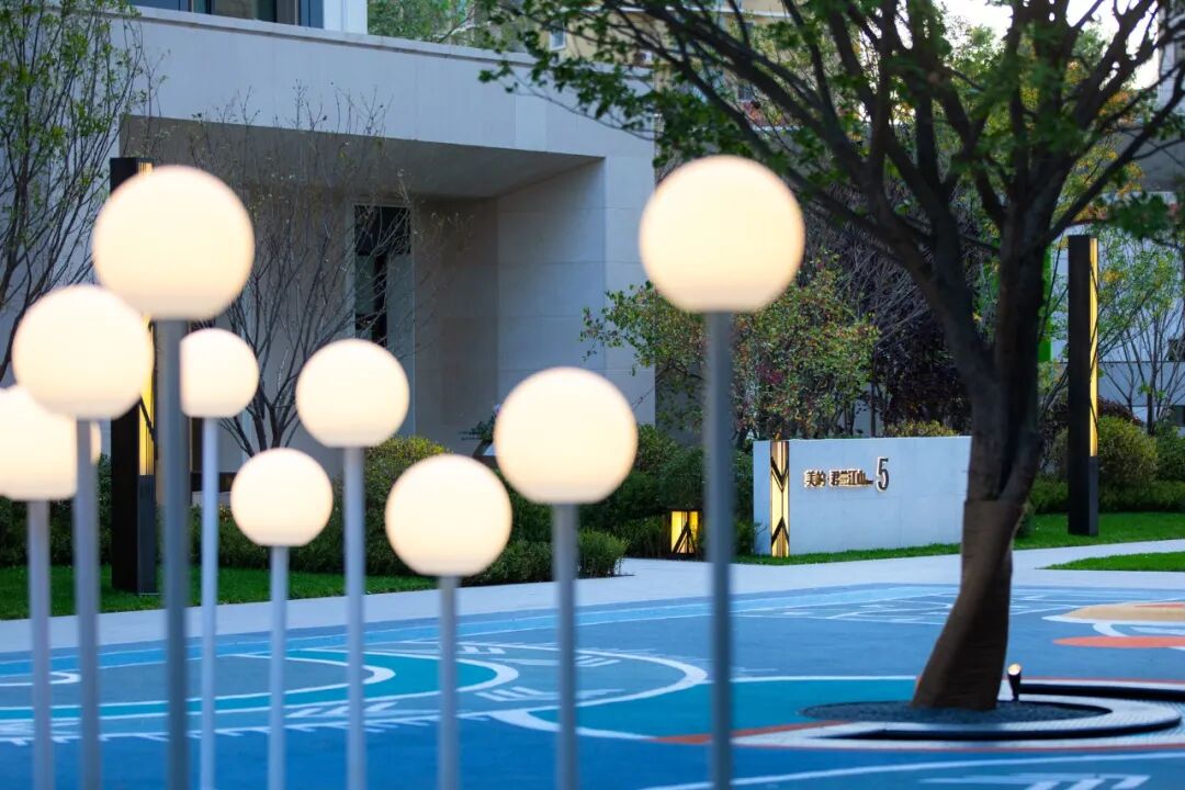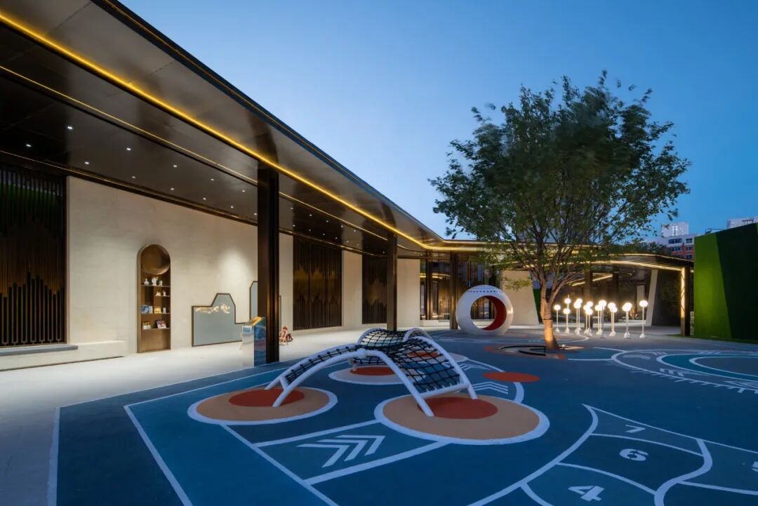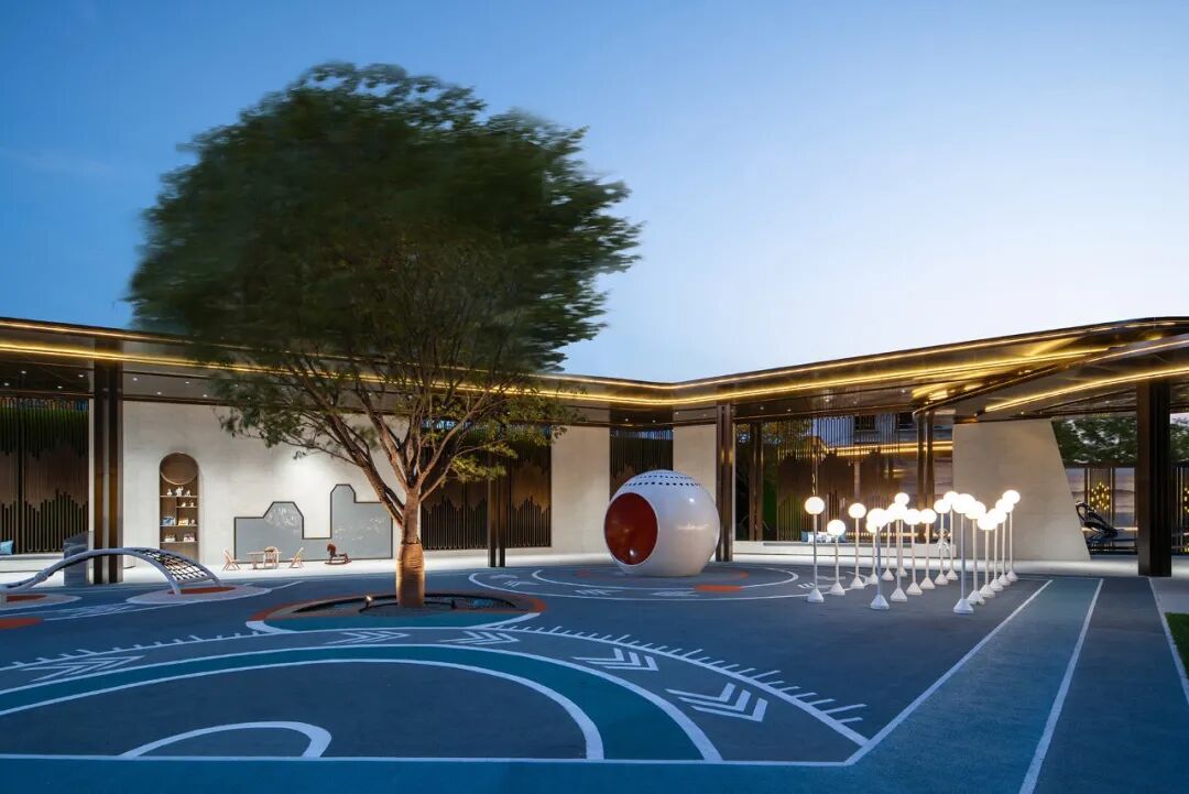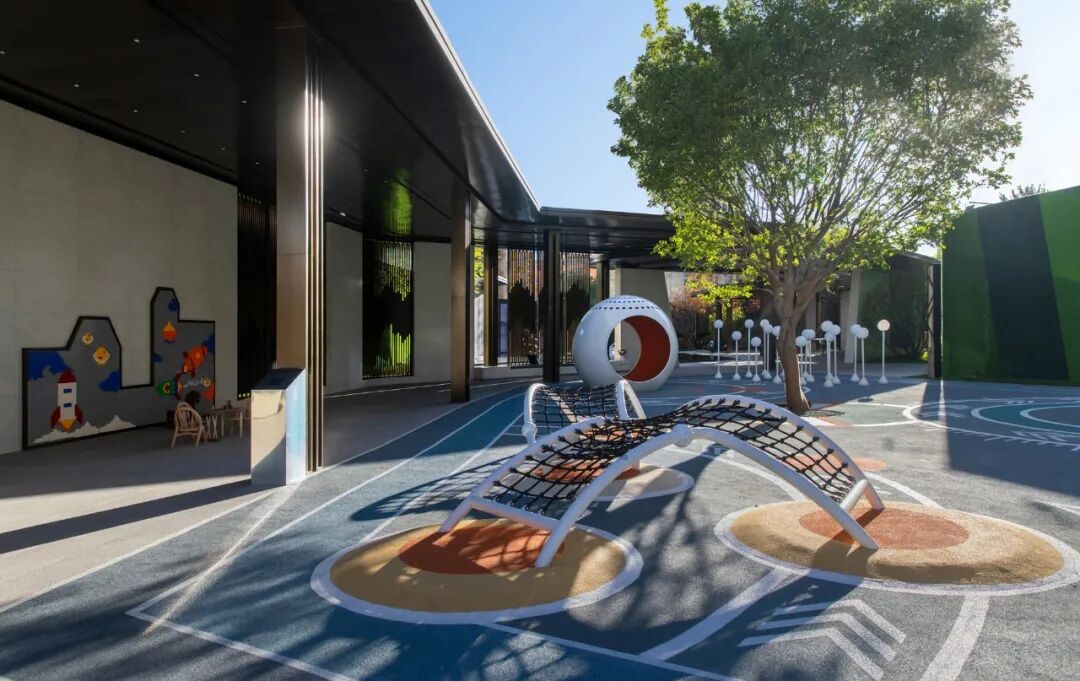 太空主题的全龄儿童活动场地——青云君游处。廊架与儿童活动场地相互结合,家长在廊架下休憩,孩子们在场地彩色场地内尽情的玩耍,遨游。