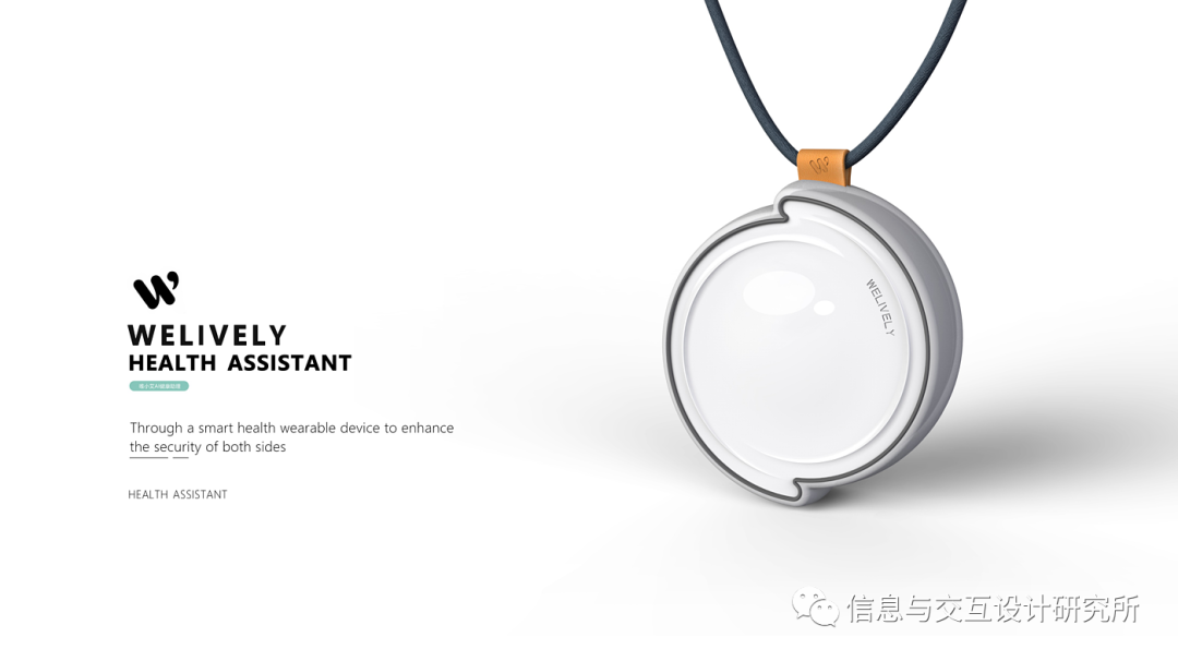 老年人智能健康穿戴设备。整体造型运用太极 “阴阳鱼” 设计理念,从传统文化中寻找产品与消费者的契合点,从而拉近两者的距离。在产品顶面有两条凸起的山脊,寓意“寿比南山”,表达出对老人美好的祝福;从拥抱中提取元素,表达出子女对父母的呵护,你陪我长大,我陪你到老。消除产品医疗感,增加产品的礼品和饰品属性。支持多种穿戴方式,给消费者提供更多便捷性,满足更多需求。智能穿戴设备满足健康检测,分析,紧急救助,家人信息共享,对接线下服务,通过这样一款智能健康穿戴设备提升父母和子女的安全感,从而增加彼此的幸福感。