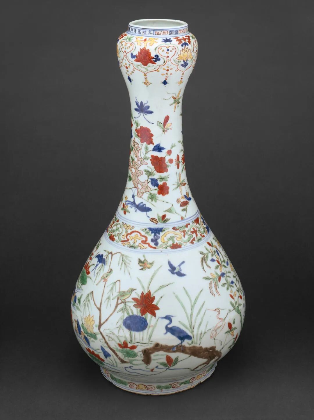 明万历 五彩鸳鸯莲池纹蒜头瓶