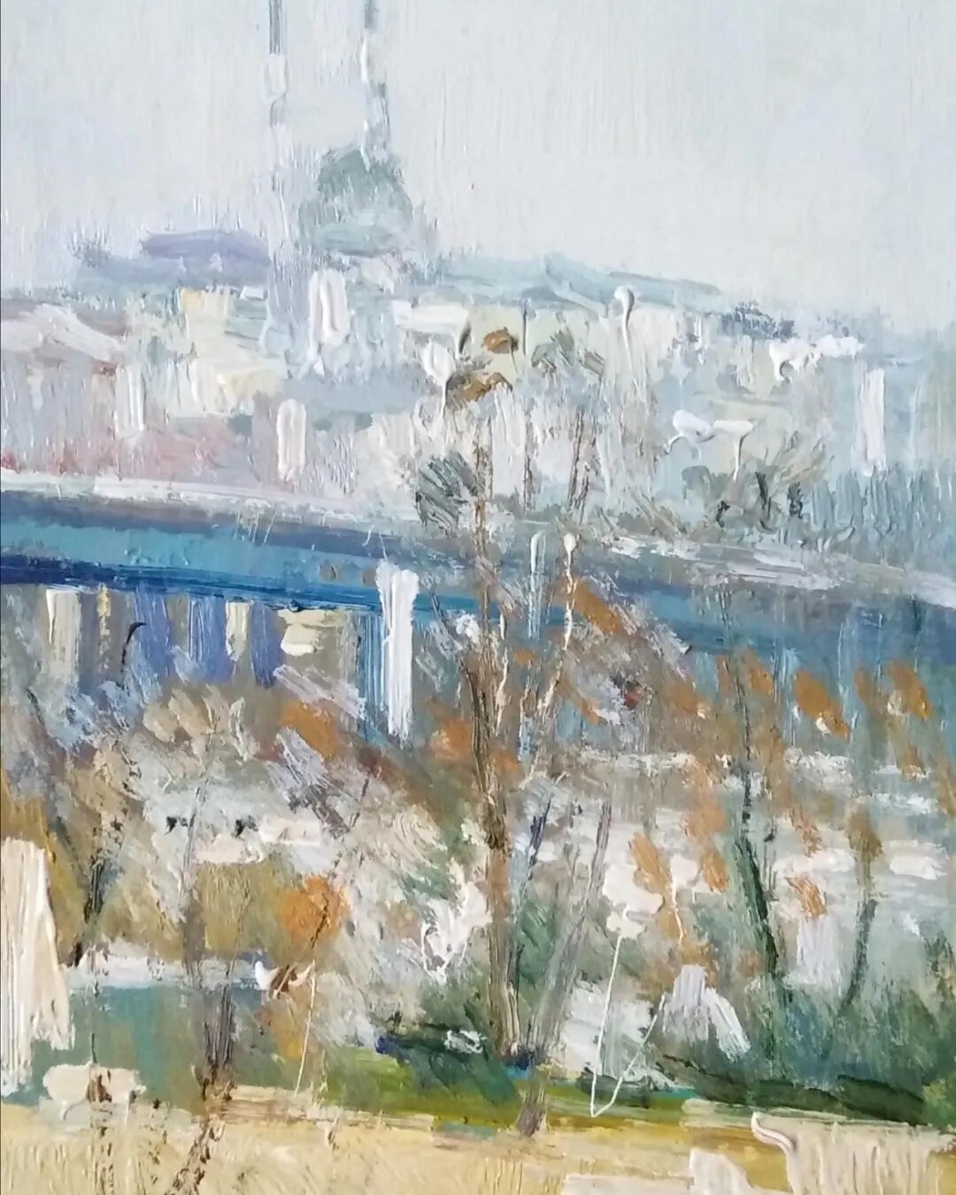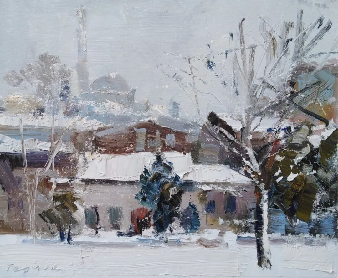 《下雪的早晨》 20 + 33 cm., Snowy morning. Oil on canvas.