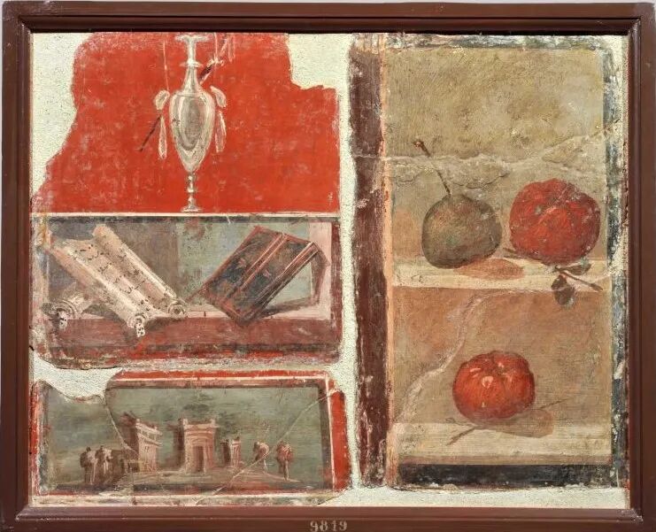 Still-life fragments representing vase,scrolls, landscape, and fruit (1st century CE), Herculaneum. National Archaeological Museum of Naples.