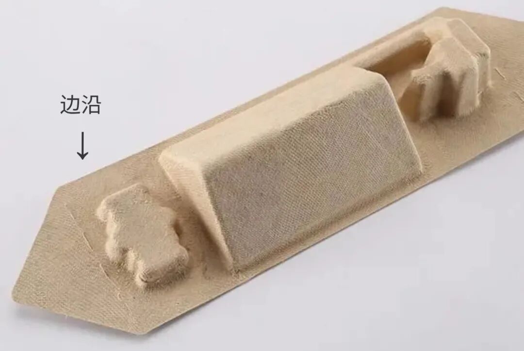 4、边沿结构:边沿结构出现在纸浆模塑顶面,尺寸通常在8-15mm。在大部分单托应用场景中,产品放入纸托腔室后与边沿平齐或略低于上端面。这种包装形式在成套产品的组合包装中应用较多。用于重型工业缓冲包装时,纸托通常上下托成对使用,边沿下伸演化成翻沿结构,以增强侧向强度。