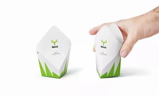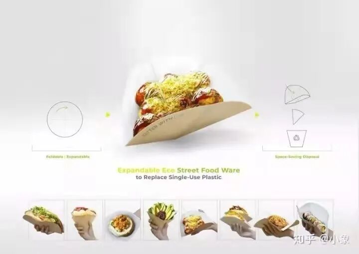 可伸缩即食小吃包装,针对形状不一的街头小吃,如热狗、塔克、寿司甚至薯条等,做到去塑统一包装。平替对环境有害的一次性塑料餐盒。这种轻便的包装容器由牛皮纸制成,里层衬有食品级蜡纸,可容纳具有刚性和柔韧性的湿或干食品。平坦放置时,直径为10英寸,并且可以自动折叠成多种形态以容纳各种份量。