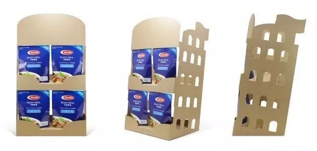 纸展示架可全方位展示出产品的特征,正面可充分展示产品,双层槽位设计便于消费者拿取。侧面采用了意大利比萨斜塔的造型设计,设计圆拱式开窗,结合后期彩色印刷,可准确迅速地传达商品来自意大利。展示架用纸非常少,组装操作简单,便于超市码货员作业。运输时可展平堆码,节省空间,节约物流成本。有良好的展示效果,可替代传统亚克力展示架。