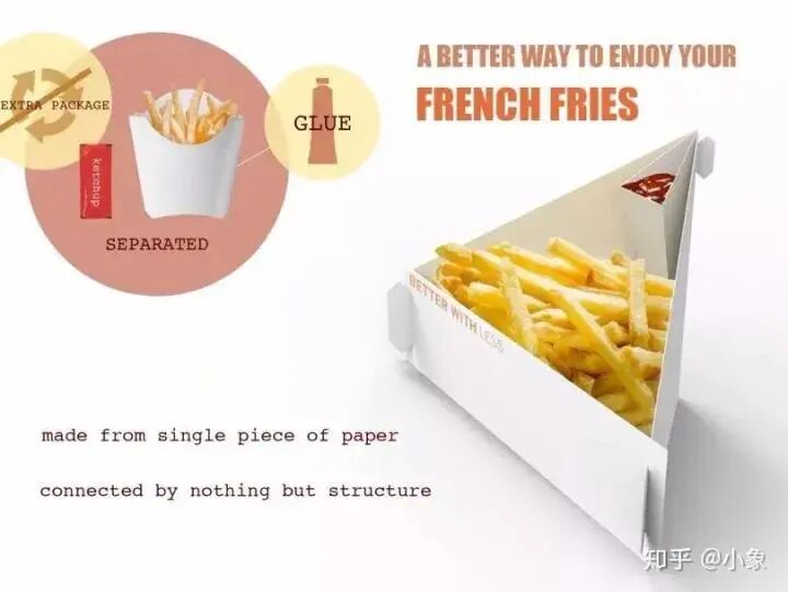 薯条包装都使用粘合纸盒盛装,配以单独塑料包装的番茄酱,这种单独包装会造成很大的包装浪费。为了解决这个问题,设计了只用一张纸就可以同时放置番茄酱和炸薯条的包装,解决了番茄酱单独包装浪费的问题,此外,一纸成型的结构无需胶水粘合,易于组装,更加安全环保。