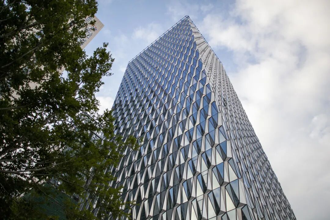 建筑外表采用单元式幕墙技术,每个单元都如同生长的细胞,区别于普通幕墙的平板效果而大胆地采用三维立体的处理方式,每个单元都是一个凸起的四方锥体,明暗与虚实随组合的单元形成了独特的变化。