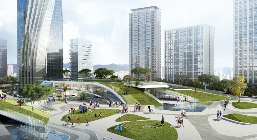 规划与建筑设计上以精巧而崭新的地域象征为出发点,基于与周边环境有完整的连续性,寻求其内在的脉络轴承,以逶迤嵯峨的“山水之形”为要素提炼,以“自然山水之美”理念为起点,融合山水文化与繁华都会的时代精神,通过原创设计,打造新建筑文化价值观,塑造观澜北区城市地标景观点,成为片区的城市名片。