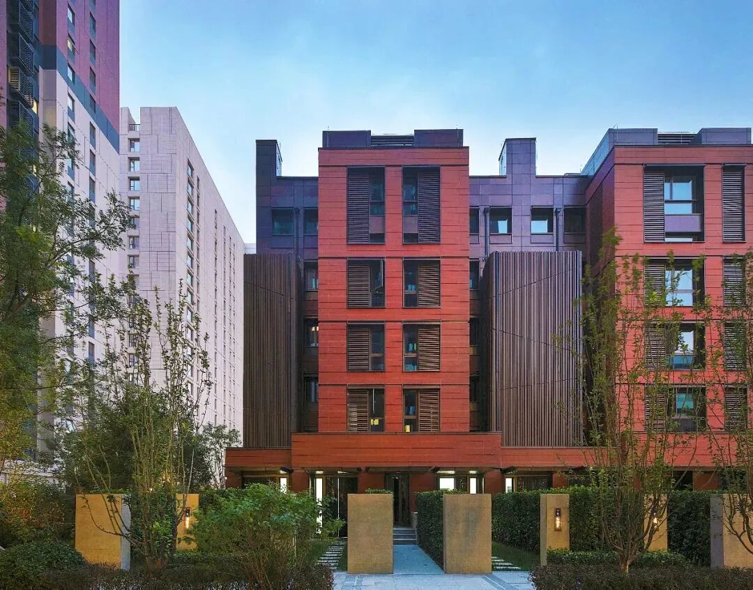在繁华的城市中心打造静谧的居住空间,尺度舒适宜人。叠墅设计的精妙之处在于宽敞的地下空间,居住者可以按照自己的家庭生活喜好进行灵活排布。外立面采用暖色调的陶土板幕墙为主,色彩鲜亮华丽,质感纯朴耐看, 具有独特的人文艺术气息,营造一种温馨的住宅立面形象。