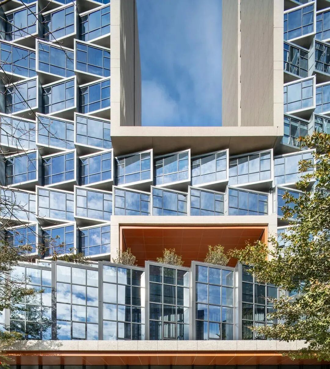顶部延续了雕塑般的设计语言,利用塔楼角部的凹槽向上转折并延伸,将女儿墙设计完美融入到了塔楼体量中,形成了一个通透的冠顶,消融在天际之中。
