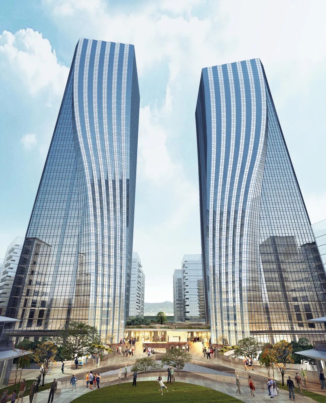 双塔盘旋上升的立面造型呼应在自然山川中提取建筑的设计语言,扭曲上升的曲线寓意着万州未来的发展趋势,寓意万川汇毕。