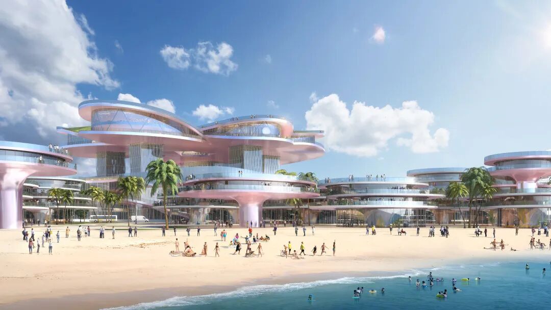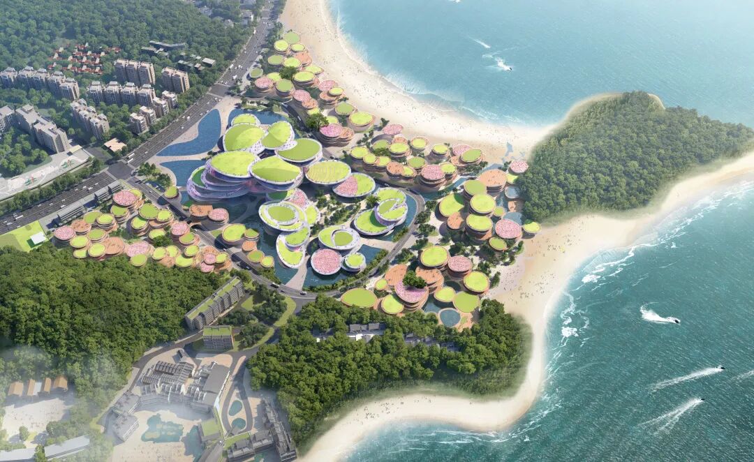 花瓣状的建筑形态与海浪形的景观融合成一种流溢着浪漫和梦幻的新美学,形成一个富有生命力的文化生态旅游岛。桃花源的视觉焦点处用水系画出一座桃花岛,岛的中央是一座漂浮在空中的文化艺术中心,与南部的日月贝交相辉映。在桃花岛的四周以十字轴线划分出四个景色、氛围、功能各不相同的区域,共同营造出一个文化生活大区。