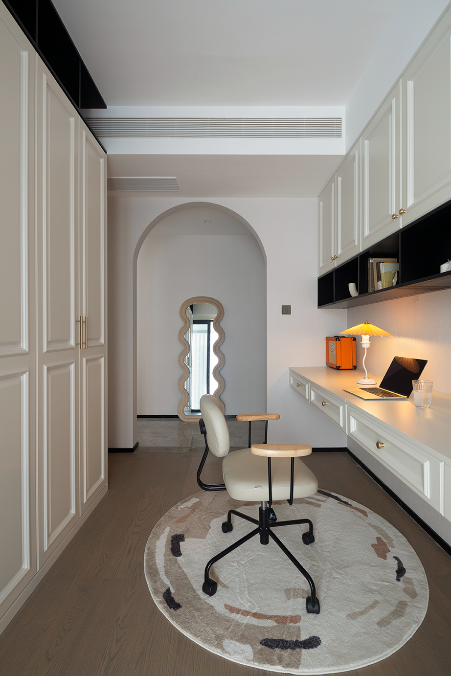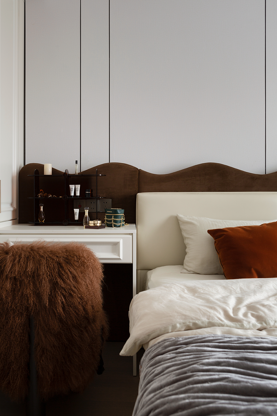 主卧的设计显得更有一派静谧氛围,波浪形床头背景墙闯入浅灰色的世界,为其注入柔情,化作独特的风景线。简约之余,更显灵动,每个细节每个物品的选用,都是温柔缱绻梦境中的必需品。